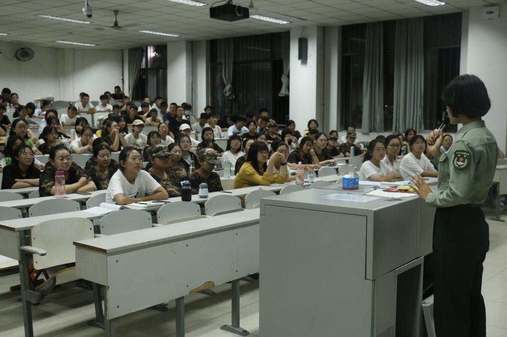 王丹丹首先为2021级同学们讲解了有趣的军旅生活,丰富的场景描述让在座的同学们都兴趣盎然。其次她为同学们讲述了严格的军事训练,通过对比自身和2021级同学们为期两周的军训,她希望2021级的同学们通过严格的军事训练提高自身的政治觉悟,激发爱国热情,发扬革命英雄主义精神,培养艰苦奋斗,刻苦耐劳的坚强毅力和集体主义精神,增强国防观念和组织纪律性,养成良好的学风和生活作风,掌握基本军事知识和技能。最后王丹丹感慨自己身为军人的两年生活,能够成为一名军人,是她做的最正确的选择之一,因为青春无悔,此生无悔。
