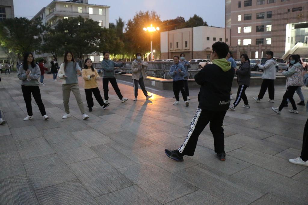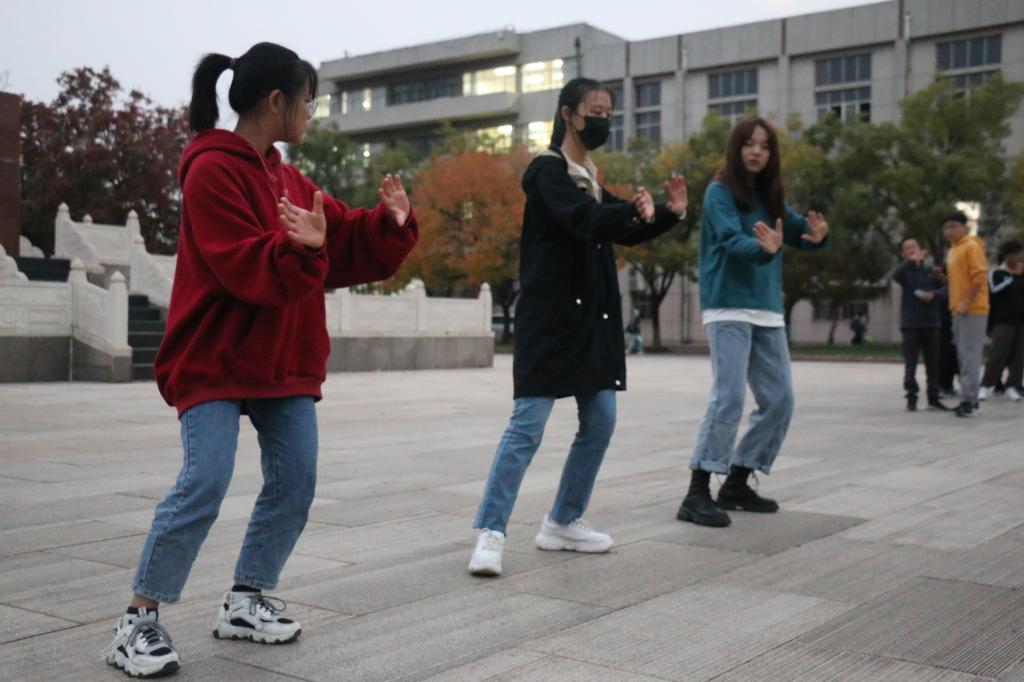 虽黄昏暮霭,秋风吹起,但却难凉队员们训练的热血。正式训练前,队员们成六列十排站立在孔子像前。随后在体育部组织下分为三组进行太极拳的正式学习。训练过程中,体育部教员细心教导,队员们一遍遍地模仿,一遍遍地自我改正。小组内成员相互纠正,互帮互助,加快了学习六艺太极拳进程。在教员的耐心指导以及队员们的刻苦训练下,同学们成功且流利地打出了六艺太极拳二十四节的第一节。半个小时后,一声“集合”,队员们又成六列十排站立,体育部部长进行总结后解散,第一次六艺太极拳训练正式结束。