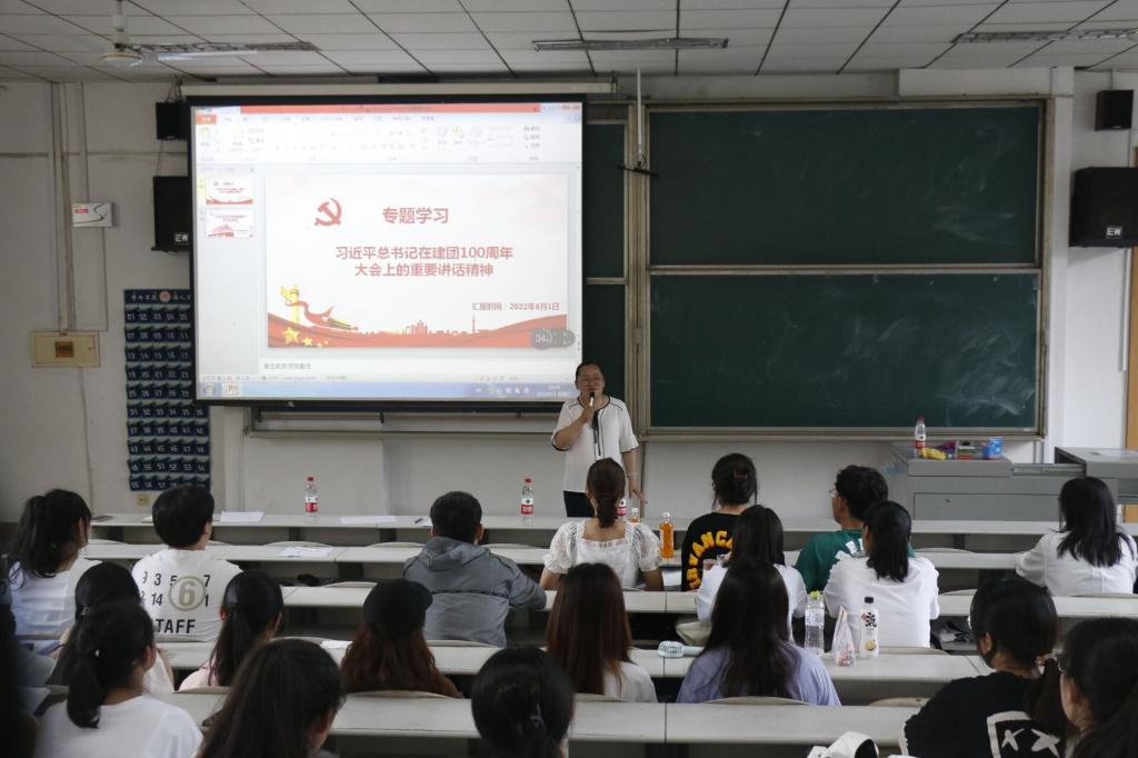 会议伊始,李宴美老师带领大家学习讲话文件精神。在庆祝中国共产主义青年团成立100周年大会上,习近平总书记发表重要讲话,深情回顾了共青团一百年来的奋斗征程,精辟概括了共青团坚定理想、矢志不渝形成的宝贵经验,并对青年一代继续奋斗、凯歌前行提出了殷切希望。李老师号召统计学子们要认真学习贯彻习近平总书记的重要讲话,树立共产主义远大理想和中国特色社会主义共同理想,自觉践行社会主义核心价值观,大力弘扬爱国主义精神,做到思想有方向、行动有力量;要坚守理想信念、补足精神之钙,更重要的是,要有坚定爬坡过坎的勇气、底气和信心。