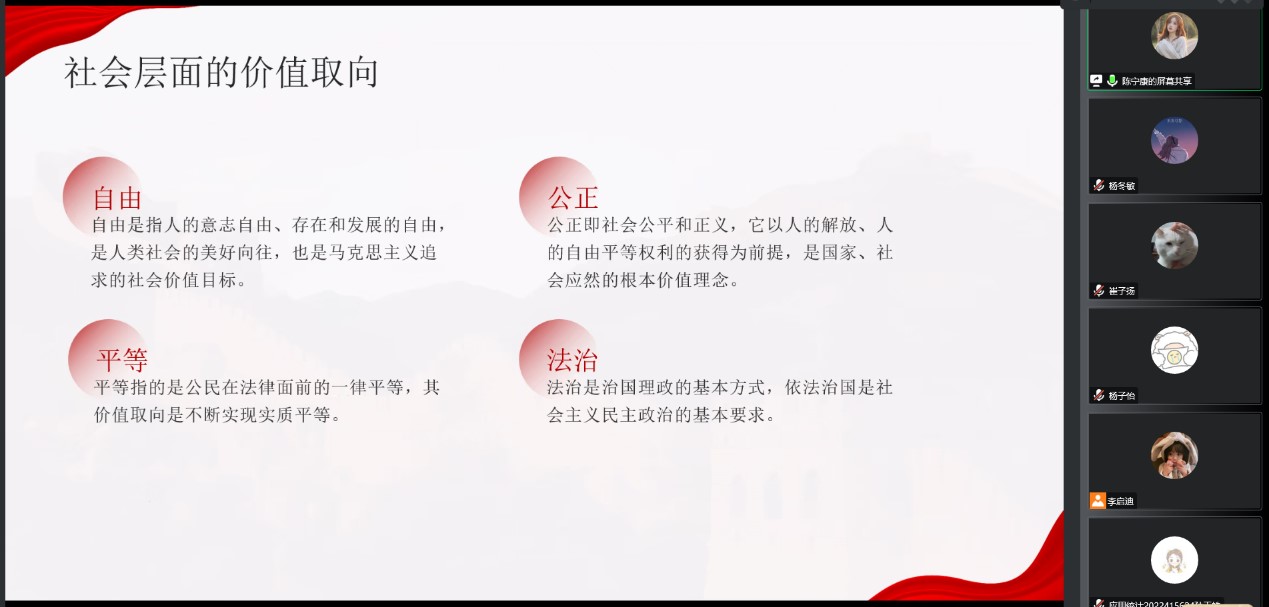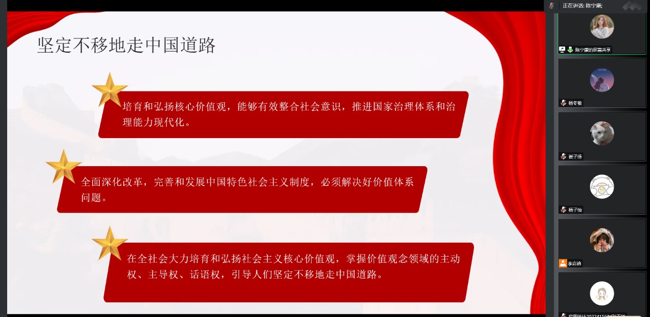 主讲人从社会主义核心价值观的背景、内容以及成就三个方面阐述了如何将社会主义核心价值观践行到日常生活的一言一行中,强调了社会主义核心价值观对个人、社会和国家的重要性和必要性,并引导同学们积极培育和践行社会主义核心价值观,增强爱国情怀和振兴祖国的责任感,不负时代,让青春在新时代绽放出绚丽之花。本次讲座不仅激发了广大学生的爱国热情,培育了广大青年的时代责任感,并且对构建文明校园,提升学生的文化自信心和民族自豪感具有重大意义。