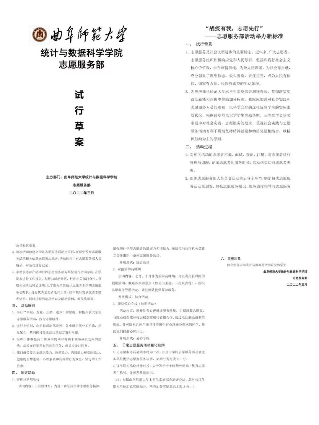 本科生素质综合测评办法,贯彻落实实践创新能力评价中奖励加分标准,统计与数据科学学院加强对社会实践和志愿服务人员的重视,以科学合理的途径反应学生的实际素质状况,制定并公布志愿服务部活动举办的新标准。