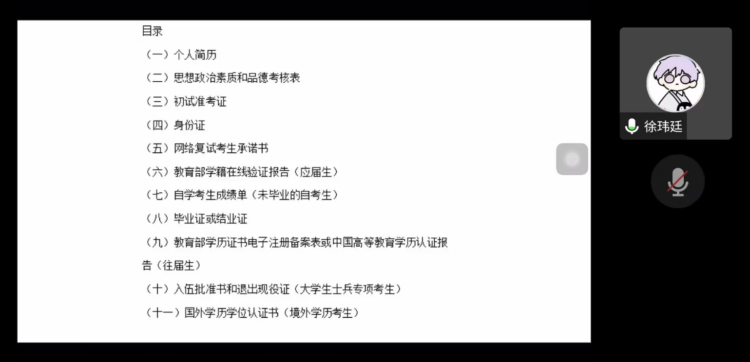 于3月5日上午九点召开线上考研复试经验交流会。本次交流会诚邀王文武老师与八位22届考研成功的学生代表,对复试注意事项和复试流程进行详细解读。本次会议由2019级辅导员李祥敏主持,2019级考研学生参加会议。