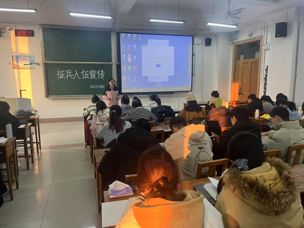20级辅导员李宴美老师在综合楼203室为20级毕业生详细解读了大学生参军入伍的相关政策,并进行了一场生动的征兵宣传活动。