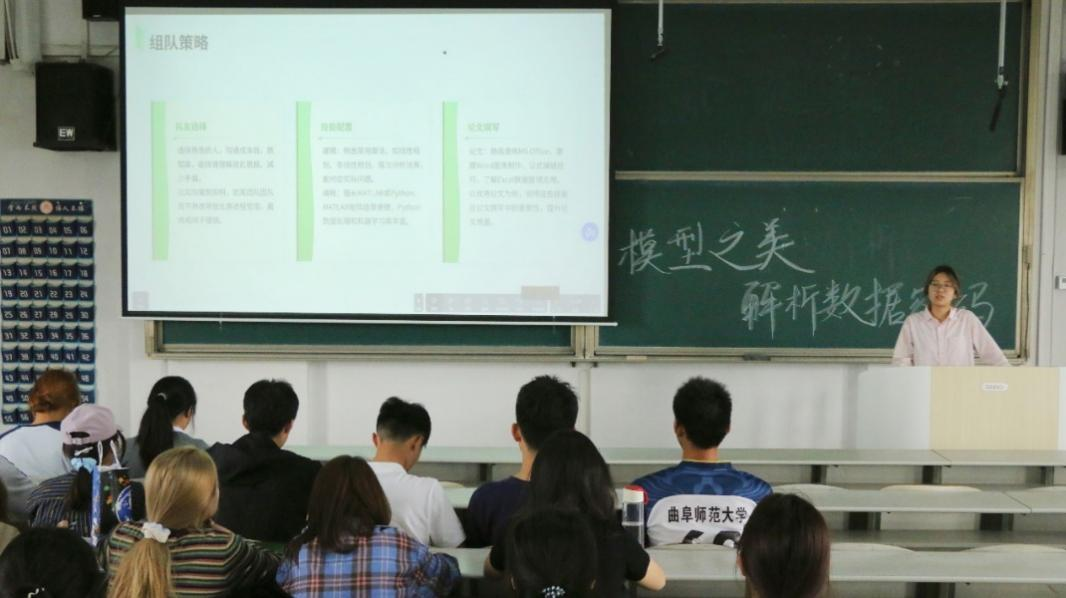 宣讲会伊始,主持人详细介绍了全国大学生数学建模竞赛的规则和赛程,包括竞赛流程和评分标准,为同学们提供了清晰的竞赛指南。随后,曾在全国大学生数学建模竞赛中,取得优异成绩的学生代表从数据收集、模型构建到结果验证等过程分享参赛经验,强调了如何运用统计知识对复杂数据进行筛选和处理,以及在建模过程中的创新思路和克服思维局限的方法。