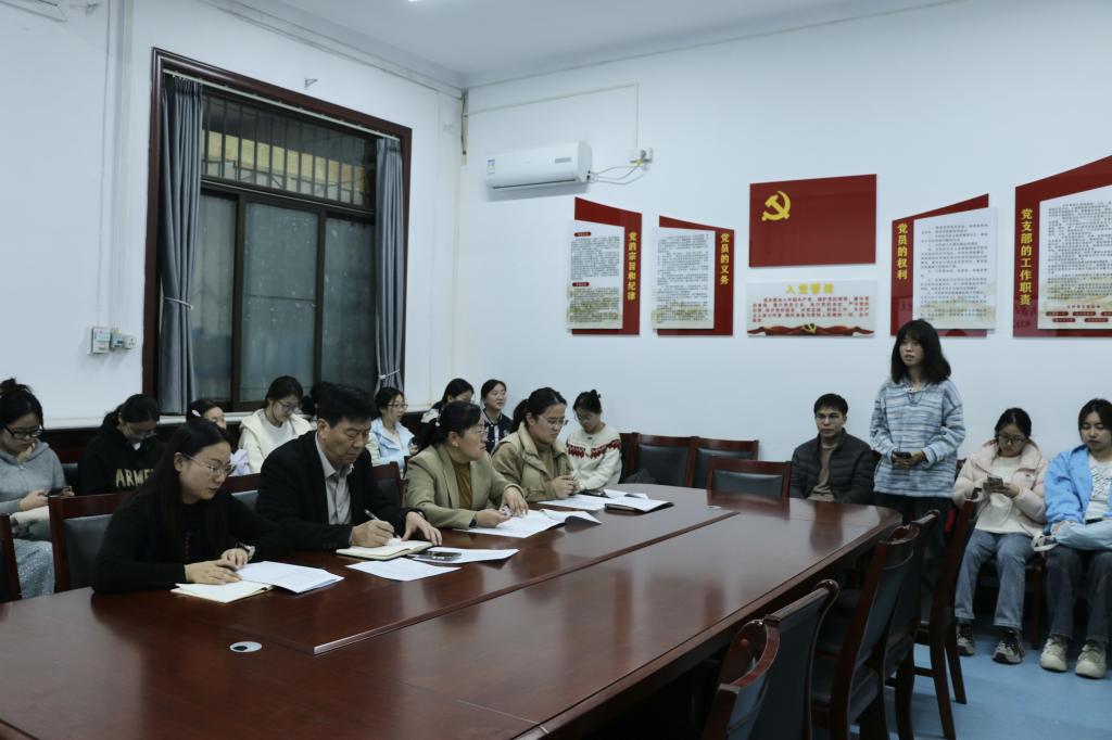 会议伊始,李宴美带领全体参会人员深入学习贯彻习近平总书记在庆祝中华人民共和国成立 76 周年招待会上重要讲话精神。围绕“实现中华民族伟大复兴是前无古人的伟大事业”这一核心,重点解读讲话中关于“党领导人民自力更生、接续奋斗取得彪炳史册辉煌成就”的重要论述,强调要从新中国 76 年发展历程中汲取精神力量,牢记“只争朝夕、永不懈怠的奋斗精神”,引导党员及预备党员深刻认识新时代青年党员的使命担当,切实将讲话精神转化为提升党性修养、强化责任意识的思想自觉与行动自觉,为后续党支部工作开展筑牢思想根基。随后,经过党支部党员讨论确定发展对象的条件。接着,培养联系人李宴美和李祥敏依次介绍董悦、袁如姣、宋炎亭、郭希璇、张雨璇、王晓晓、王晓晴、杨煦八位发展对象的情况。