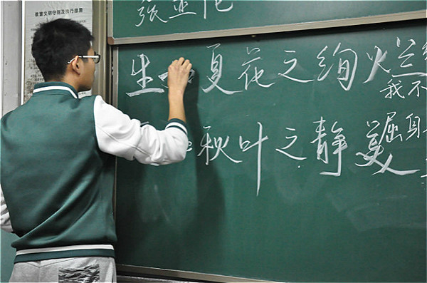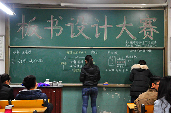 在主持人简单介绍比赛流程和比赛要求后,精彩的“板书设计大赛”就正式开始了。每组共有三人同时进行,限时三分钟。每三组过后主持人宣布上三组成绩。流线英文、创意艺术字、挥毫毛笔字、整齐板书等让台下观众连连称赞。