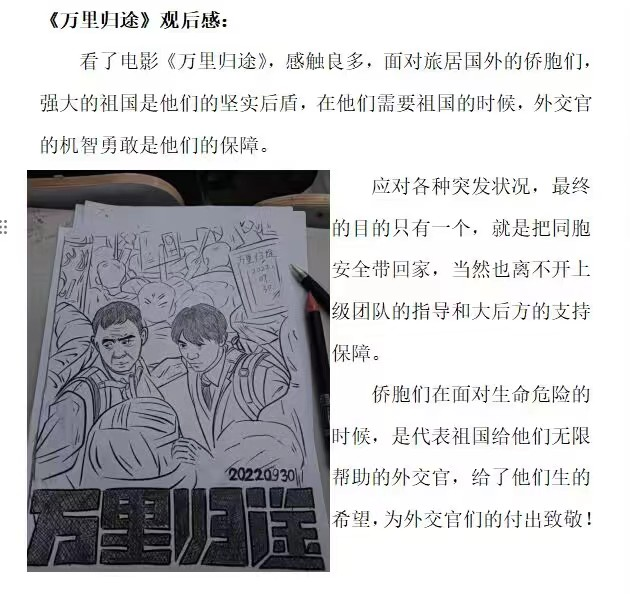 本次活动采用线上的方式,同学们通过观看特定电影,描绘出认为电影中最励志、最令人感动的画面,并写出100-200字的心得体会。活动期间,同学们积极参与,以电子版或者手绘的形式呈现出一幅幅优秀的作品,表达了同学们对国家安全的深切思考与浓浓的爱国之情