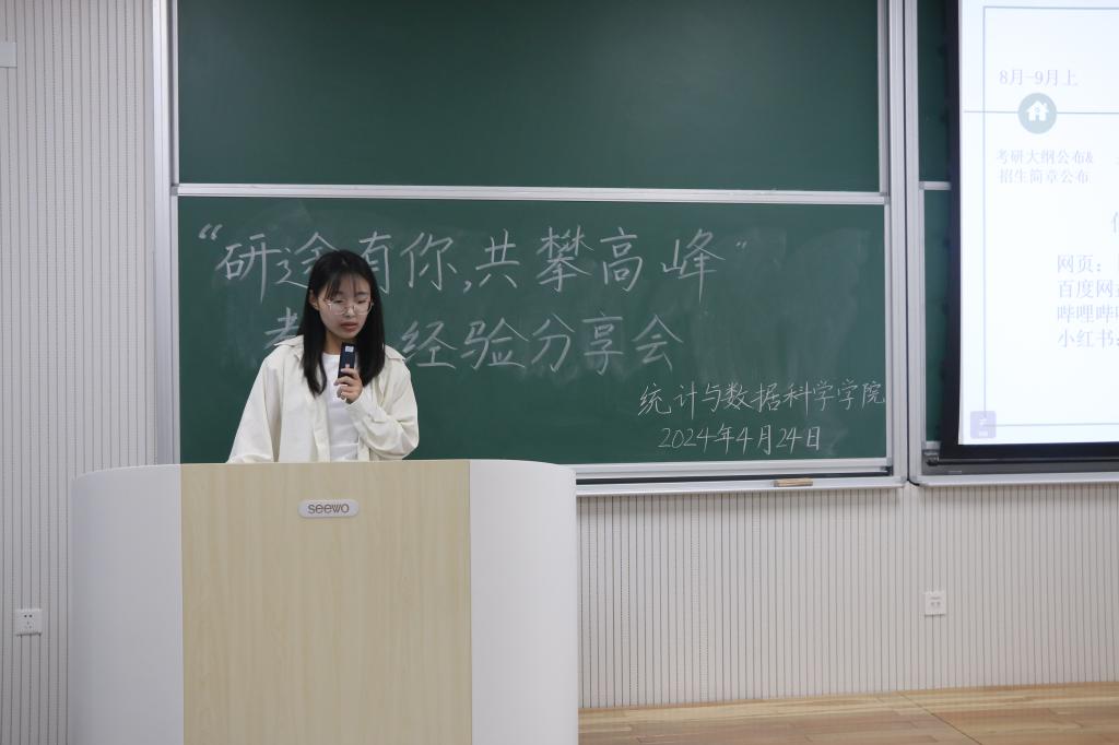 于4月24日晚上7点在格物楼B106举办“研途有你,共攀高峰”考研经验分享会。本次分享会由刘佳宁、翟伟颖、刘盈月、周仁杰、班会柯五位优秀学子主讲,2021级和2022级学生自愿参加本次活动。