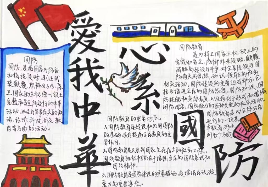活动要求同学们围绕国防主题设计手抄报,内容需积极向上、充满正能量,旨在提升同学们对国防事业的关注度。活动期间,同学们充分发挥创意与才华,完成了众多优秀作品。这些作品形式多样,既有通过生动画面展现国防建设的辉煌成就,也有的讲述感人故事致敬英雄人物壮举,还有的别出心裁以漫画形式普及国防知识,这充分体现了同学们对祖国的深厚情感与对国防事业的坚定支持。