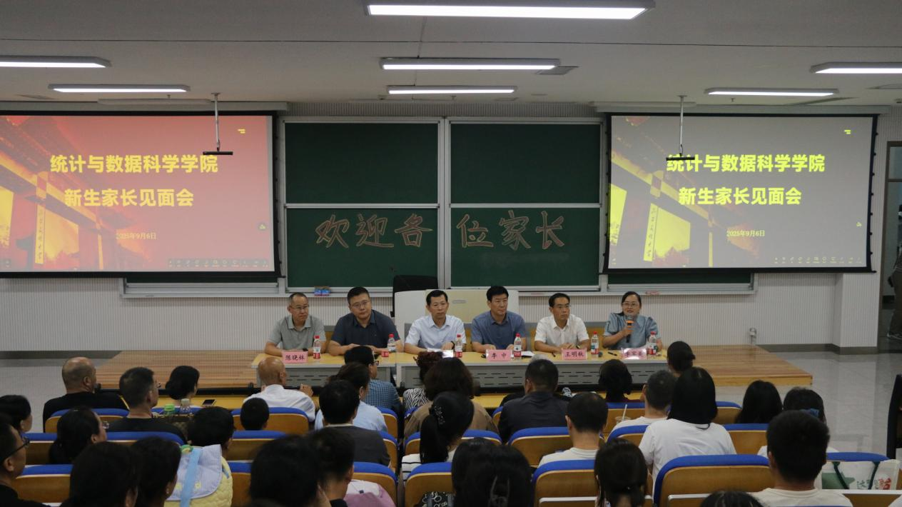 于致知楼B101举行新生家长见面会,院长赵胜利、党委副书记季中、副院长赵翔华、团委书记李宴美和统计系主任陈晓林、数据科学系主任王明秋,及2025级新生家长代表参加见面会,会议由亚洲杯直播