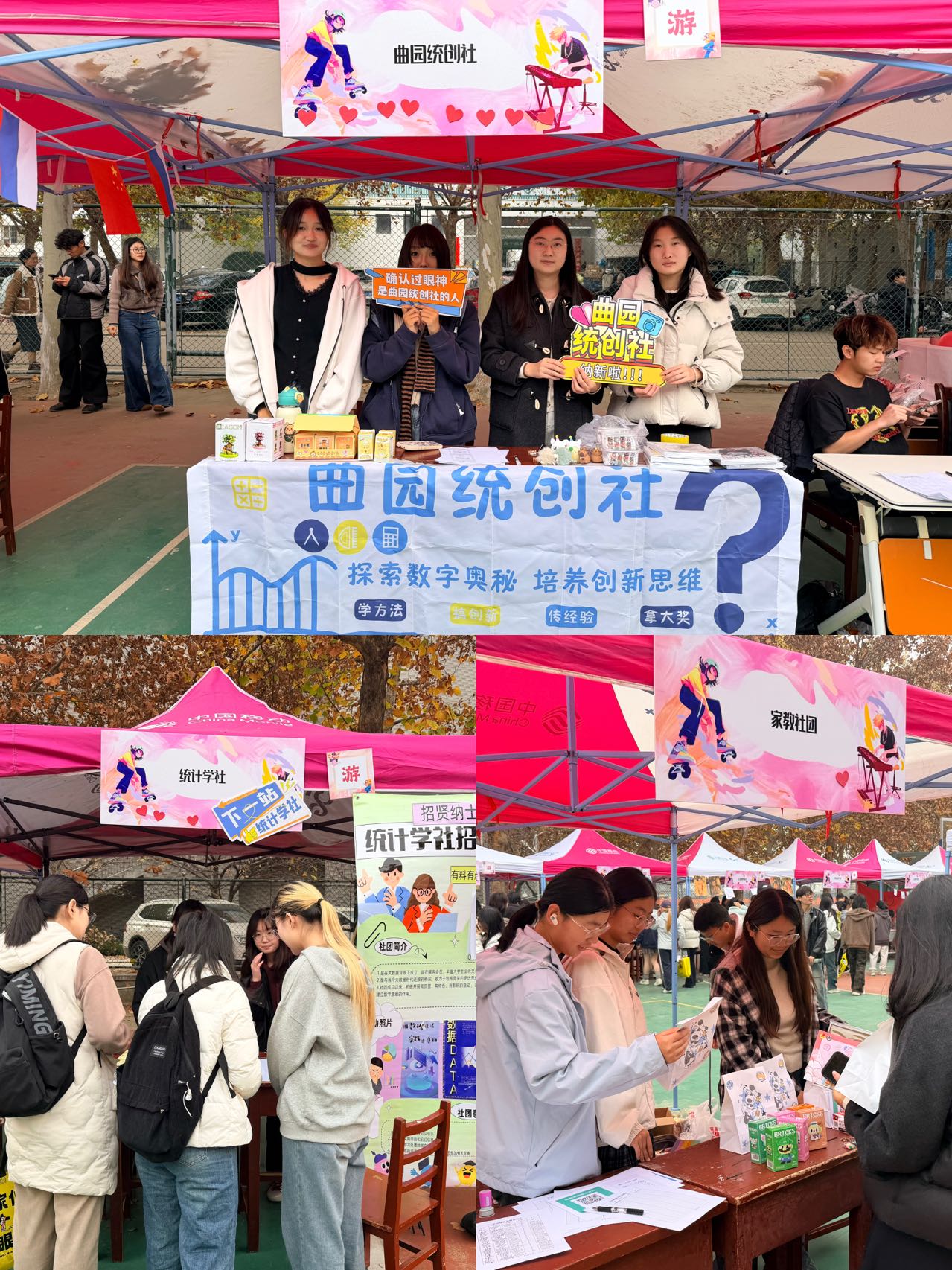 下属的三大社团——曲园统创社、统计学社与家教协会纷纷亮相,吸引大批同学驻足了解。