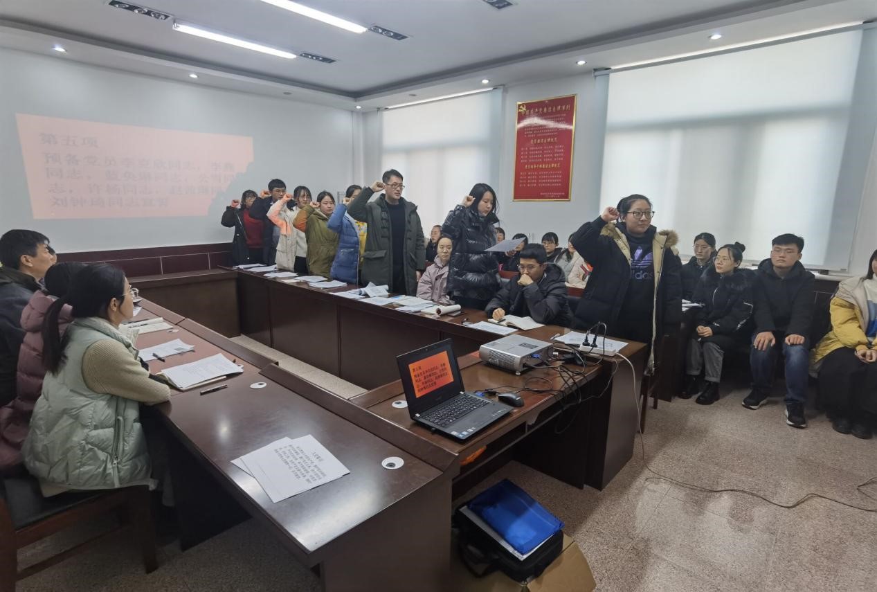 会议的主要内容是讨论关于李克欣、李燕、蓝奂琳、公雪、许杨、赵茜琳、刘钟琪7名同志按期转为正式党员的问题。会议伊始全体起立奏唱国歌,参会人员面对党旗行注目礼。之后,由7名同学的分别宣读转正申请书以及介绍自身情况和努力方向。7名同学都积极向党组织靠拢,展现了他们对党的尊敬和忠诚。随后党支部党员讨论并进行不记名投票。经过党支部的讨论,最终的投票结果是这7名同学都全票通过,同意他们加入中国共产党。由领誓人纪青林带领7位同学宣誓。最后由亚洲杯直播