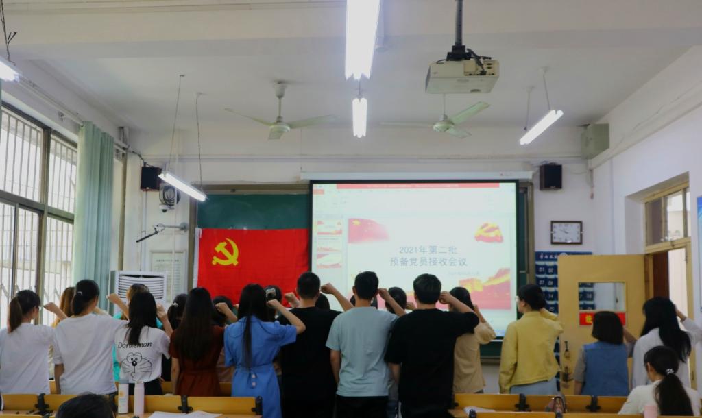 会议伊始,由李宴美同志清点到会人数,并奏放国歌。接下来由梁佳慧、刘妍妍、张子璇、胡秀辉、李梦云、郭易、董秋悦、张欣怡、庞惠心、李洁、章玉莹、杨琨、苗世超、吴华清、荆晓语、孔悦、陈心雨、徐静、王子怡、李述一、李扶摇、毛伯阳二十二位发展对象宣读入党志愿书,并向党组织汇报自身对党的认识、入党动机、个人经历等基本情况。入党介绍人肯定了他们在学习和生活中的优异表现,并给出相关建议。接着全体正式党员讨论并通过无记名投票表决的方式一致同意接收二十二位同志成为预备党员。会议最后,预备党员同志们面对党旗进行庄严宣誓,向大会表达了自己的意志与决心。