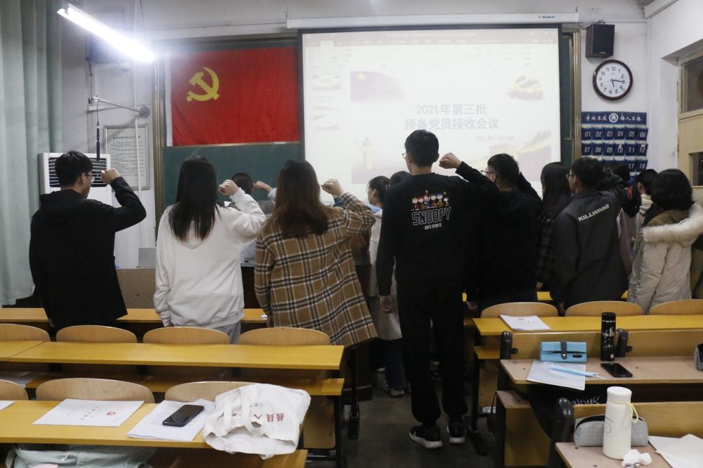 会议始伊,由李宴美同志清点到会人数,并奏放国歌。接下来由杨祎、彭修锦、王佳宁等二十二位发展对象宣读入党志愿书,并向党组织阐述自身对党的认识、入党动机、个人经历等基本情况。入党介绍人李宴美和张风姣老师肯定了他们在日常生活中的优异表现并提出相关建议。接着,全体正式党员讨论并通过无记名投票表决的方式一致同意接收二十二位同志成为预备党员。会议最后由季中书记对本次会议进行总结,并代表党支部全体成员对这二十二名同志表示由衷的祝贺和深切的厚望。希望他们不忘初心、努力学习,充分发挥共产党员的先锋模范作用,把党的优良品质扩大化、具体化,增强党的吸引力,凝聚力,将党的优良传统传递下去,成为一名真正合格的中国共产党员。