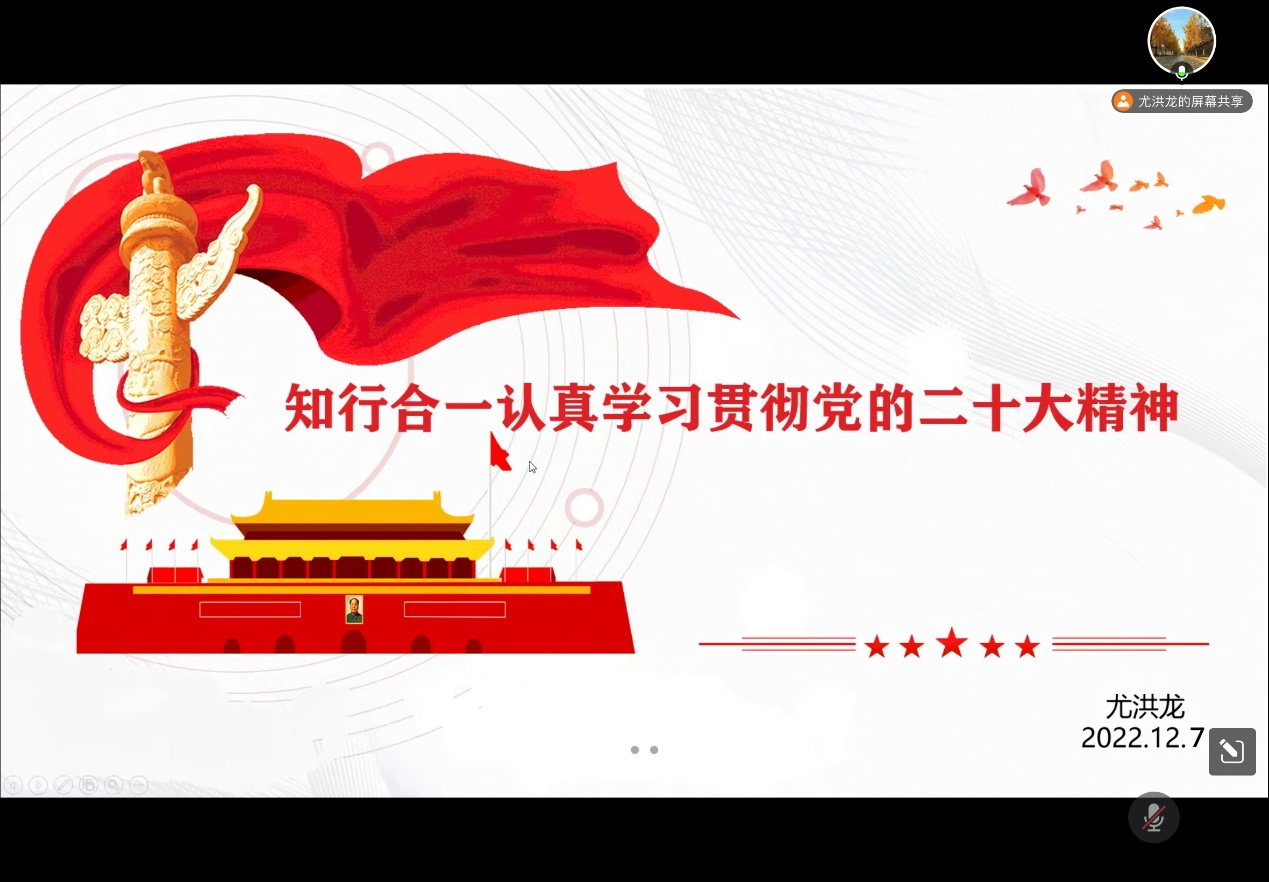 研究生党支部于2022年12月7日在腾讯会议线上召开以“知行合一认真学习贯彻党的二十大精神”为主题的支部党员大会。研究生党支部书记尤洪龙担任此次会议主讲人,研究生党支部全体党员参加会议。