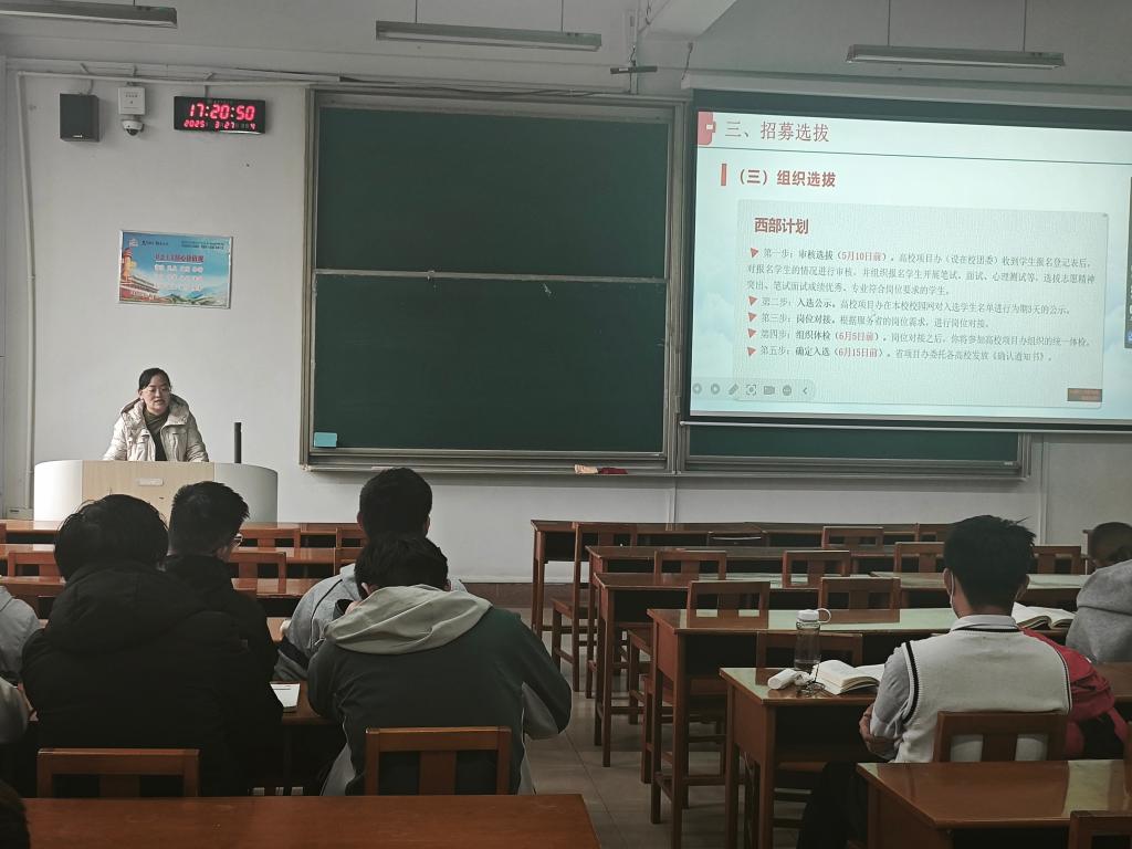 在综合楼举行大学生志愿服务西部计划专题宣讲会。本次活动以 "到西部去,到基层去,到祖国最需要的地方去" 为主题,通过政策解读、典型案例分享和互动交流,引导青年学子将个人理想融入国家发展大局。2021级全体毕业生参会。