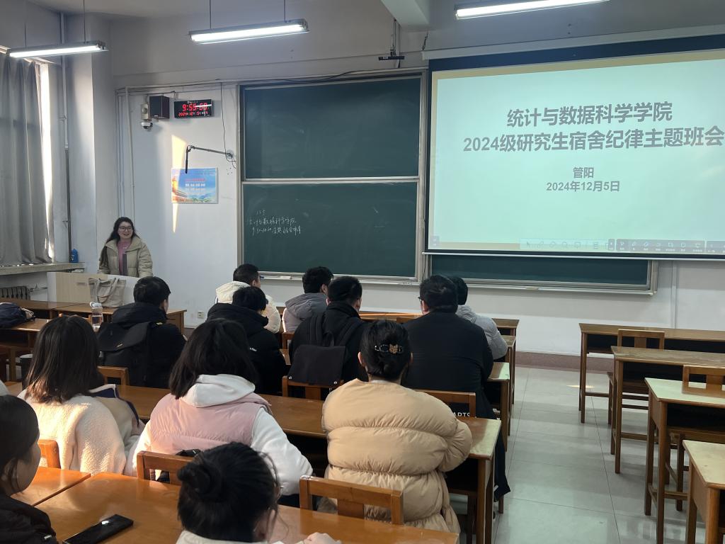 在综合楼403室举办了2024级研究生宿舍纪律主题班会。此次班会由研究生辅导员管阳老师主持,全体2024级研究生参与,旨在提升学生的宿舍纪律意识和自我管理能力,促进学生间的相互理解和尊重,共同营造一个安全、和谐、有序的宿舍环境。
