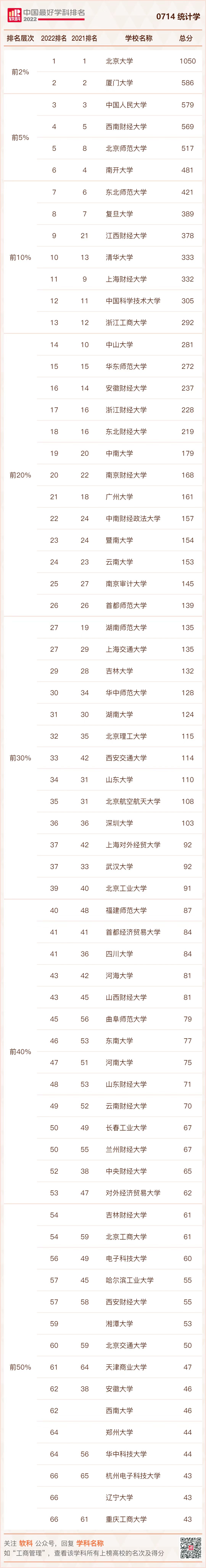 2022年9月21日,高等教育评价专业机构软科正式发布“2022软科中国最好学科排名”。排名榜单包括96个一级学科,各个学科排名的对象是在该一级学科设有学术型研究生学位授权点的所有高校,发布的是在该学科排名前50%的高校。共有484所高校的5035个学科点上榜。其中,统计学学科排名共有68所大学上榜,亚洲杯直播
