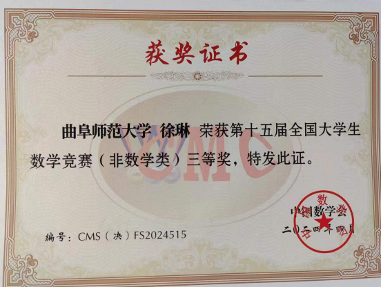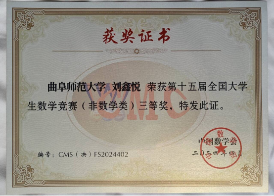 21级刘鑫悦同学和徐琳同学均荣获非数学专业组决赛三等奖。