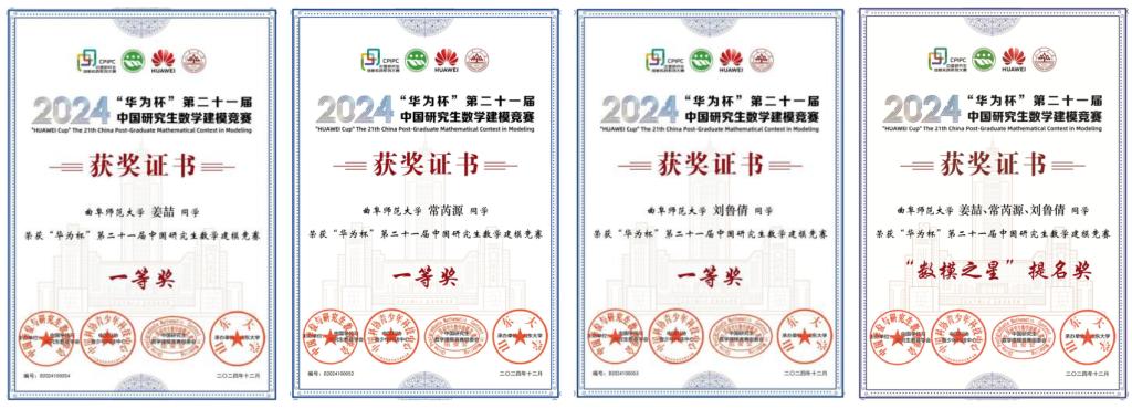 v 在“华为杯”中国研究生数学建模竞赛中,荣获2项国家级奖项,其中一等奖1项、三等奖1项;
