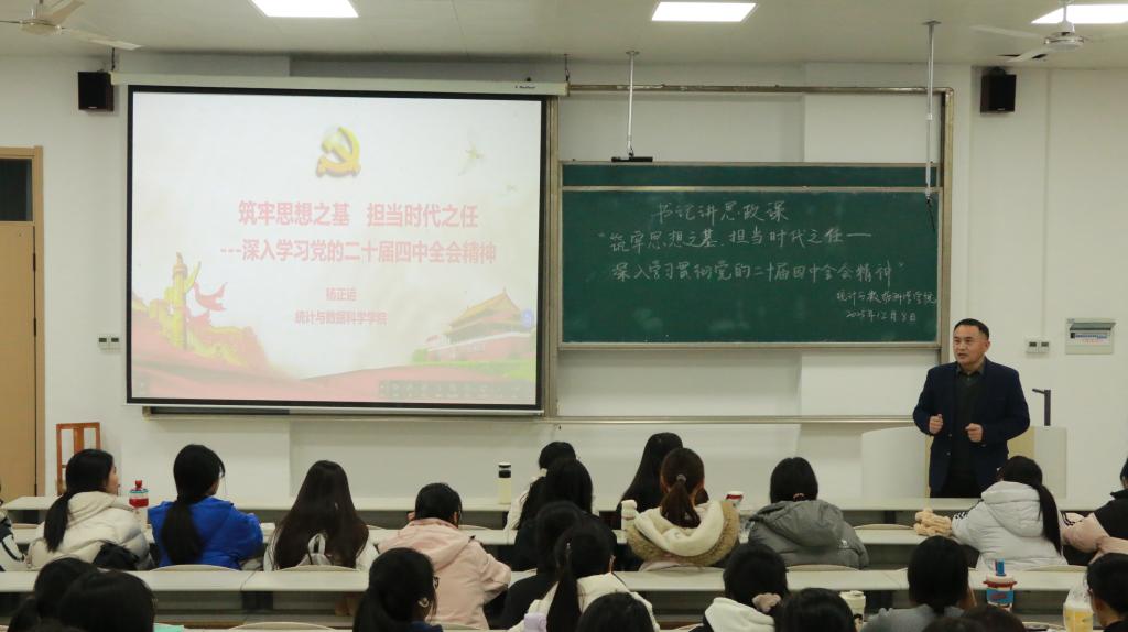 杨书记从全会精神要义解读、大学生思政教育、青年使命担当三大板块展开。重点聚焦《中共中央关于制定国民经济和社会发展第十五个五年规划的建议》等内容,并结合历史纵深与学科特色展开论述,介绍了统计学科在大数据分析、人工智能+统计、国民经济核算等领域的应用成果,以及师资团队在国家级科研项目中的攻关能力,鼓励学生尽早对接导师参与课题研究,在数据建模、实证分析等实践中夯实专业基础。