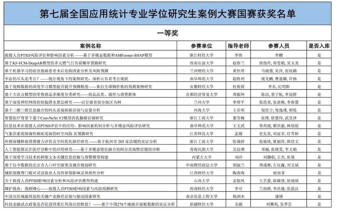 第七届全国应用统计专业学位研究生(MAS)案例大赛自4月开赛以来,全国共有191所科研院所和高等院校的1236支队伍提交案例作品参赛。经过校赛、区域赛、国赛(通讯评审)的严格评审,共有76个案例作品入围国赛现场答辩赛。经现场答辩赛的激烈角逐,最终评出一等奖20个,二等奖56个,三等奖111个;另有32个优秀案例入选“全国应用统计专业学位教育教学案例库”。
